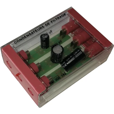 Schakelelement met 3 parallel geschakelde condensatoren op een zeer robuust transparant kastje – bedoeld om elektrische schakelingen te bouwen en uit te leggen in de natuurkunde klas. Ideaal voor lesgeven over condensatoren.