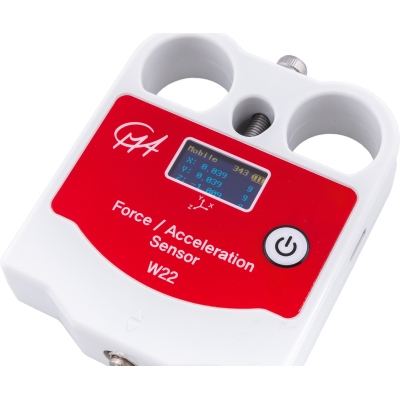 De draadloze Kracht/Versnellingssensor W22 meet tegelijkertijd kracht en versnelling zonder het ongemak van draden. De sensor meet krachten in het bereik van -80 tot 80 N en versnelling langs drie onafhankelijke assen, x, y en z, in het bereik van -16 .. 16 g.