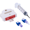 Een LED indicatie op de lichtsluis knippert iedere keer wanneer een druppel de lichtstraal onderbreekt. De Druppelteller heeft nog twee ronde gaten waarmee eventueel ook een pH sensor en een temperatuursensor in de vloeistof geplaatst kunnen worden. De druppelteller wordt geleverd met een plastic 20-mL injectiespuit met Luer-lock sluiting, twee 2-wegkleppen met Luer-lock aansluiting en een plastic pipetpunt.