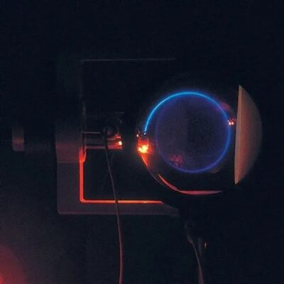 Met de Helmholtzspoelen (1000644), voeding (1003308) en houder (1008507) is een uitgelijnd magnetisch veld te creëren. Hiermee kan de elektronenbundel uit het verticaal geplaatste kanon rondgebogen worden zodat een cirkel ontstaat. (deze bijbehorende producten moeten apart besteld worden)