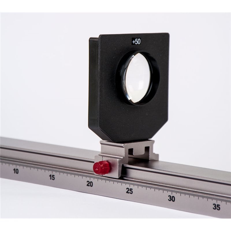 Convergerende glazen lens van hoogwaardig glas in kunststof houder voor optica practicum, bijvoorbeeld de lenswet. Functioneert ook als condensorlens.
