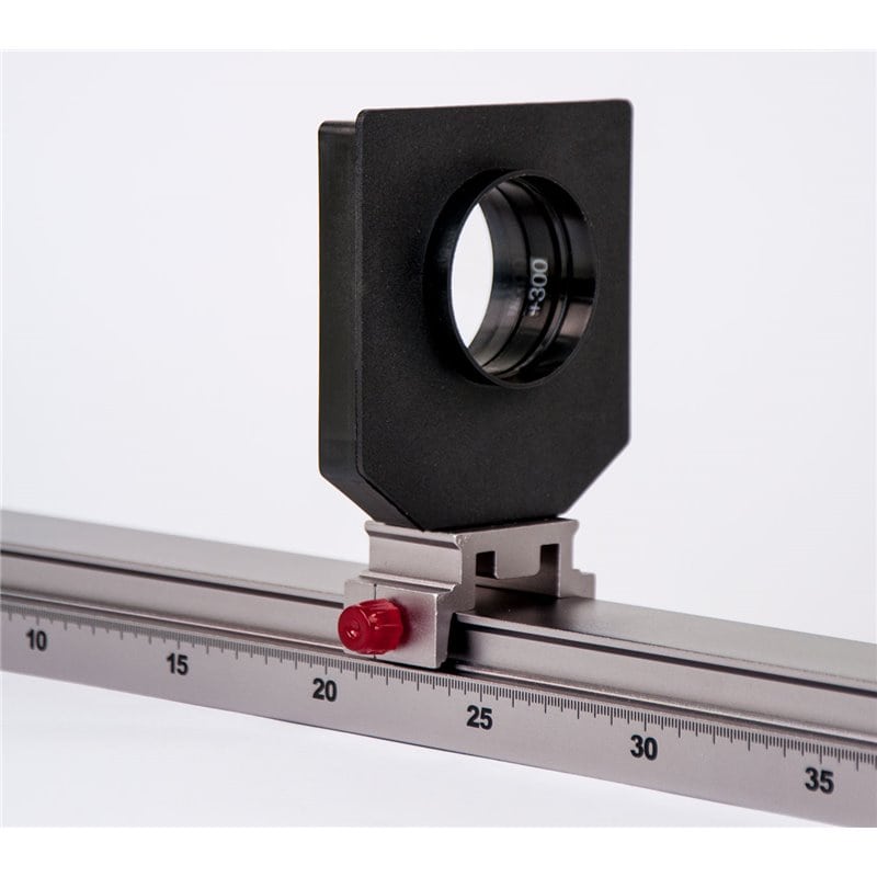 Convergerende glazen lens van hoogwaardig glas in kunststof houder voor optica practicum, bijvoorbeeld de lenswet. Functioneert ook als condensorlens.