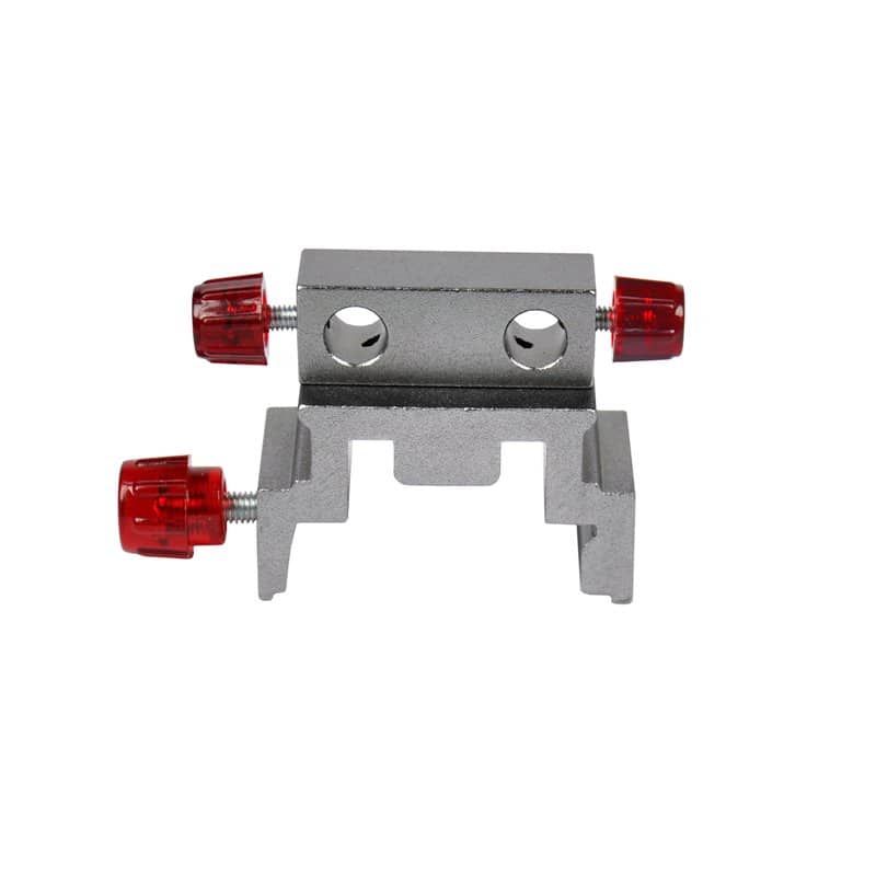 Schuif met blok met twee gaten voor het vasthouden van twee thermische uitzettingsbuizen, borgschroeven aan de zijkant van het blok, borgschroef op de schuif