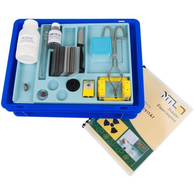 Leskoffer voor voor het uitvoeren van 17 experimenten over atoomfysica, kernfysica en radioactiviteit over de volgende onderwerpen: