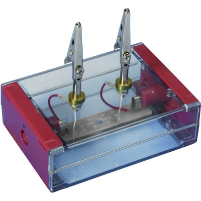 Twee krokodillenklemmen op een zeer robuust transparant kastje – bedoeld om draadweerstand uit te leggen in de klas. Ideaal voor lesgeven over elektriciteit. Diverse metalen draden (ijzer, wolfraam, constantaan) kunnen hier tussen geklemd worden.