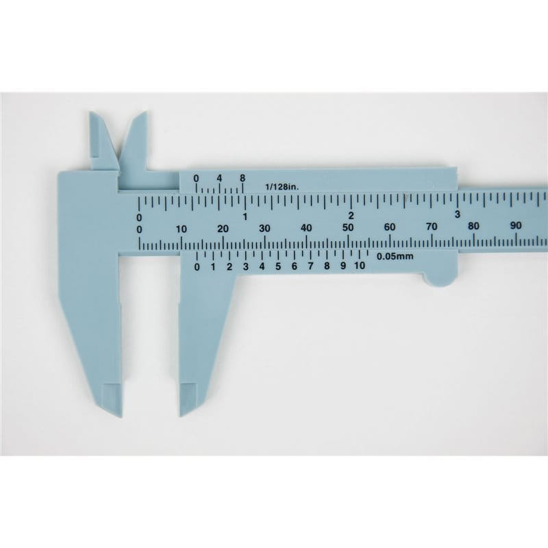 Schuifmaat van hoog kwaliteit kunststof, voor buiten-, binnen- en dieptemetingen, en om te leren hoe je een noniusschaal correct afleest.