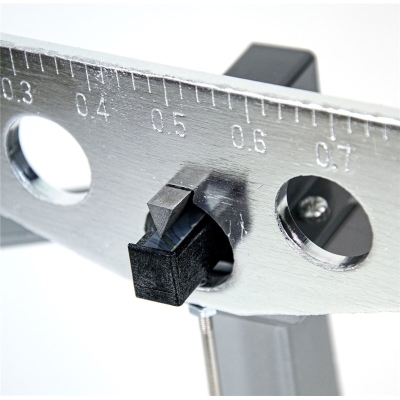 Weegbalk met nulstelschroeven, lange metalen wijzer met schaalverdeling, draaibare steunplaat voor drijfvermogenmetingen, vergrendelknop, grondplaat met stelschroeven en waterpas voor nauwkeurige horizontale positionering van de weegschaal.
