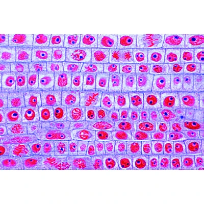 - Mitose in de wortelpunten van een boon (Vicia faba) (lengtedoorsnede). De wortelpunten laten alle mitose-stadia zien. Gekleurd met IJzer hematoxyline