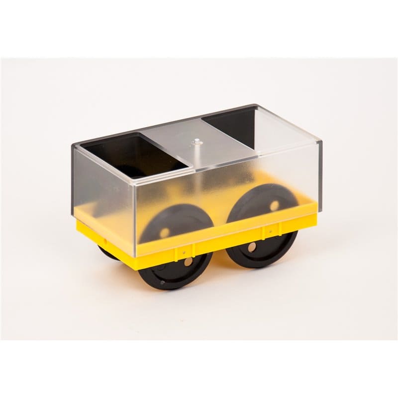 De carrosserie, bevestigd op het meetkarretje, dient als detectoroppervlak voor experimenten met de afstandssensor of als schaduwscherm voor experimenten met gevorkte lichtschermen, en tevens voor het stabiliseren van de pin met bevestigde schijfmassa’s.