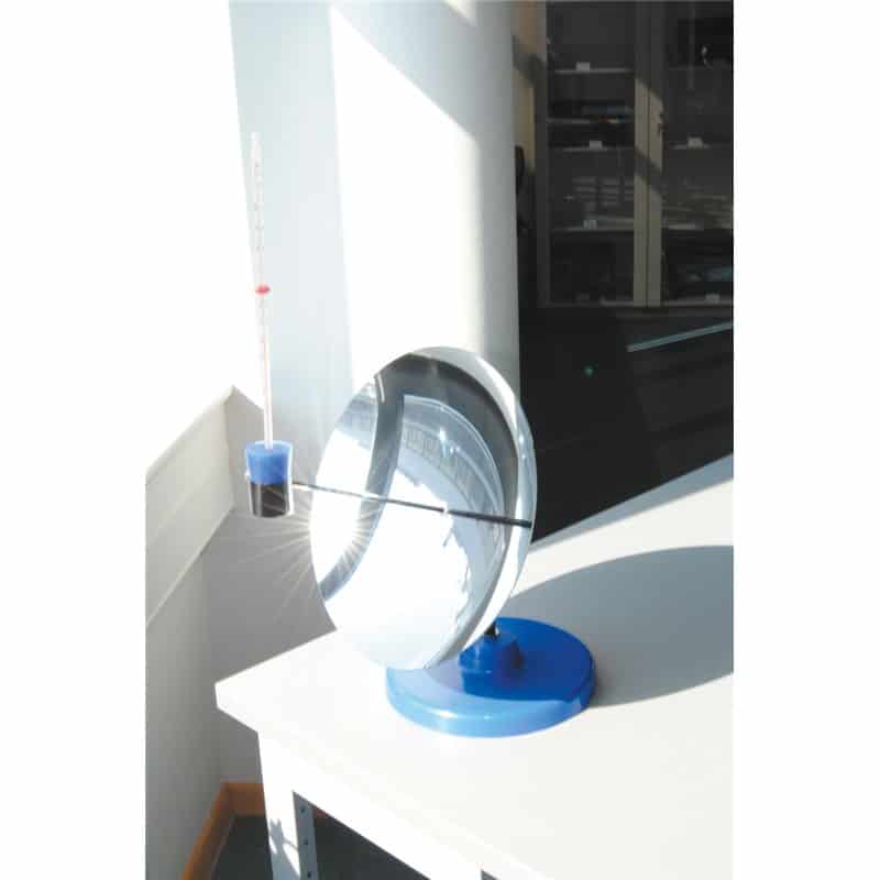 Parabolische spiegel van kunststof, kleine metalen houder bevestigd in het brandpunt voor het verwarmen van materialen, grote voetplaat en steunstang met verstelbare verbinding voor optimale aanpassing van de invalshoek.