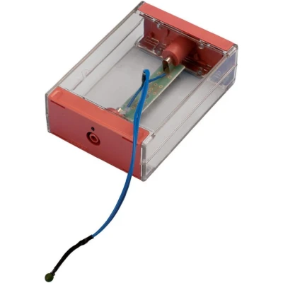 PTC-weerstand (Positieve Temperatuur Coëfficiënt) op een zeer robuust transparant kastje – bedoeld om elektrische schakelingen te bouwen en uit te leggen in de natuurkunde klas. Thermistor waarvan de elektrische weerstand aanzienlijk toeneemt naarmate de temperatuur stijgt. De PTC zit op een draad, waardoor deze makkelijk te richten is.