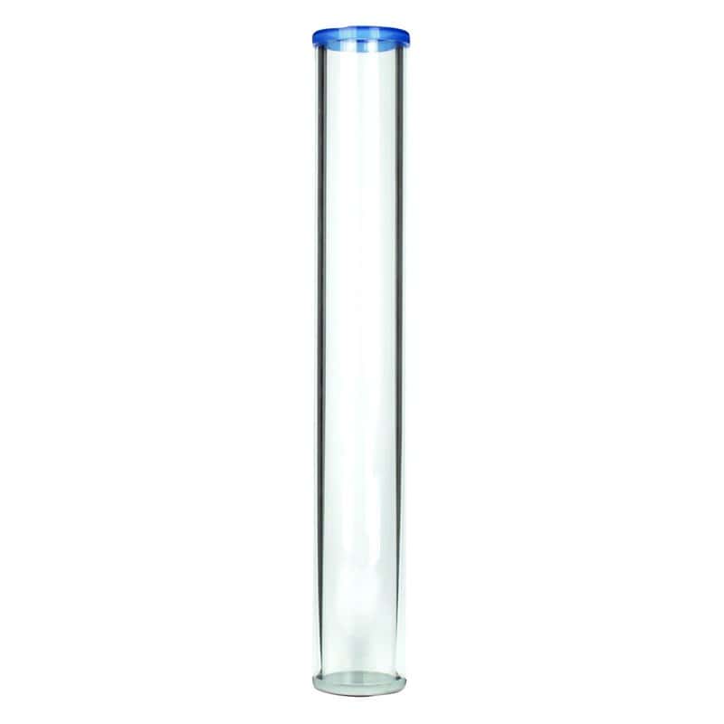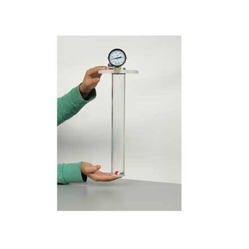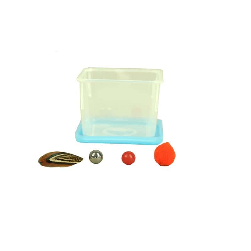 Acrylbuis met siliconen afdichting en 4 objecten om in de buis te doen (één van metaal, één van piepschuim en één van wol, plus een klein stukje kippenveer)