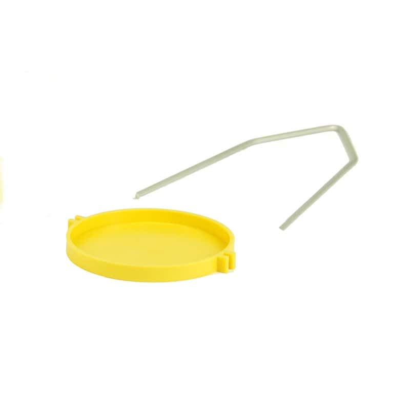 Gewichtenhouder met opstaande rand van dikwandig kunststof met stevige metalen ophangbeugel.