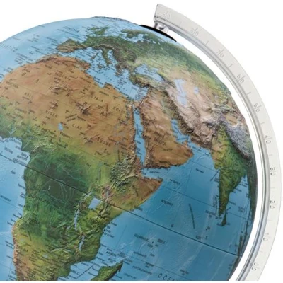 Tafel globe of wereldbol met verlichting op een metalen, met kunststof versterkte standaard, voorzien van een dubbele kaart en een voelbaar 3D-reliëf van bergketens. Zonder verlichting toont de globe een fysieke kaart van de aarde. Met verlichting wordt de huidige politieke situatie weergegeven met een contrasterende afbakening van de landen en hun grenzen.