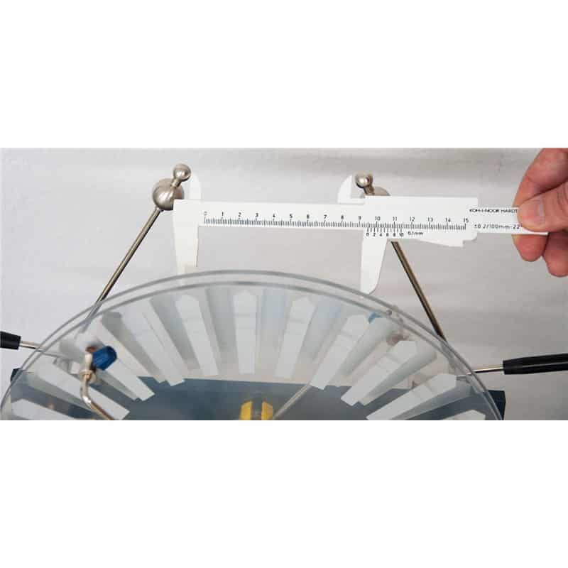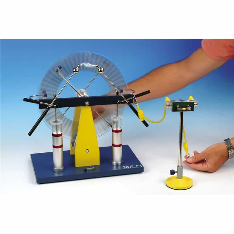 Wimshurst machine, gemonteerd op statief. Met slinger, snaaraandrijving, isolerende plexiglas schijven, 2 Leidse flessen en verstelbare vonkenbrug. Hoge kwaliteit, productie in de EU.