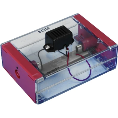 Zoemer op een zeer robuust transparant kastje – bedoeld om elektrische schakelingen te bouwen en uit te leggen in de klas.